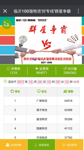 2017年12月4日,在为我园区华中物流投票时发现,我物流公司也在“群星争霸”的赛事中,票数为一千多票,排在第12名,当时非常激动,董事长马守田亲自组织,副总主持,召开广缘物流专线经理和各部门会议,专题研究利用此次赛事,把广缘物流积累的二十余年的能量发挥出来,把客户群体对广缘的信赖感调动起来,同时召开各分公司视频会议,让收货人对广缘物流做更加全面的评价。